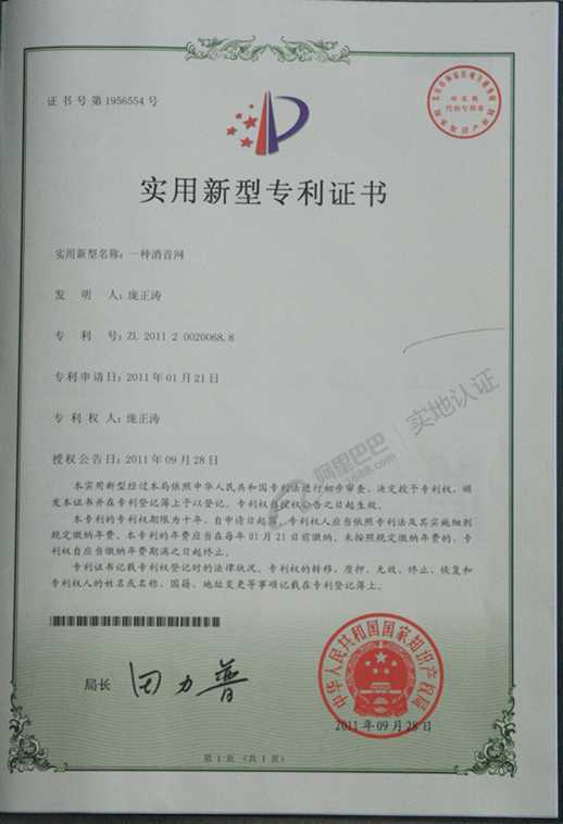 2011年09年28日,由我厂生产厂长庞正涛研发的新型汽配专用消音网荣获中华人民共和国国家知识产权局颁发的实用新型专利证书。专利号:ZL 2011 2 0020068.8
