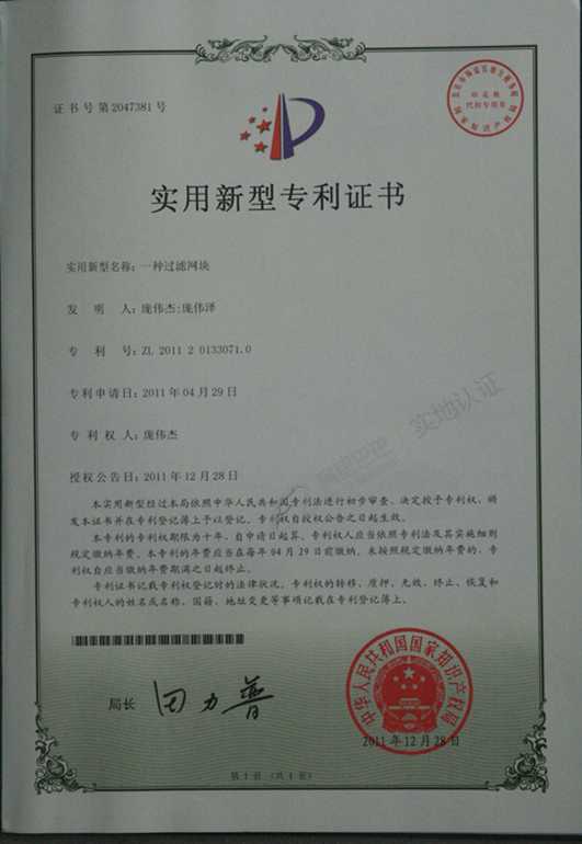 2011年12年28日,由我厂生产研发部庞伟杰、庞伟泽共同研发的新型过滤网块荣获中华人民共和国国家知识产权局颁发的实用新型专利证书。专利号:ZL 2011 2 0133071.0